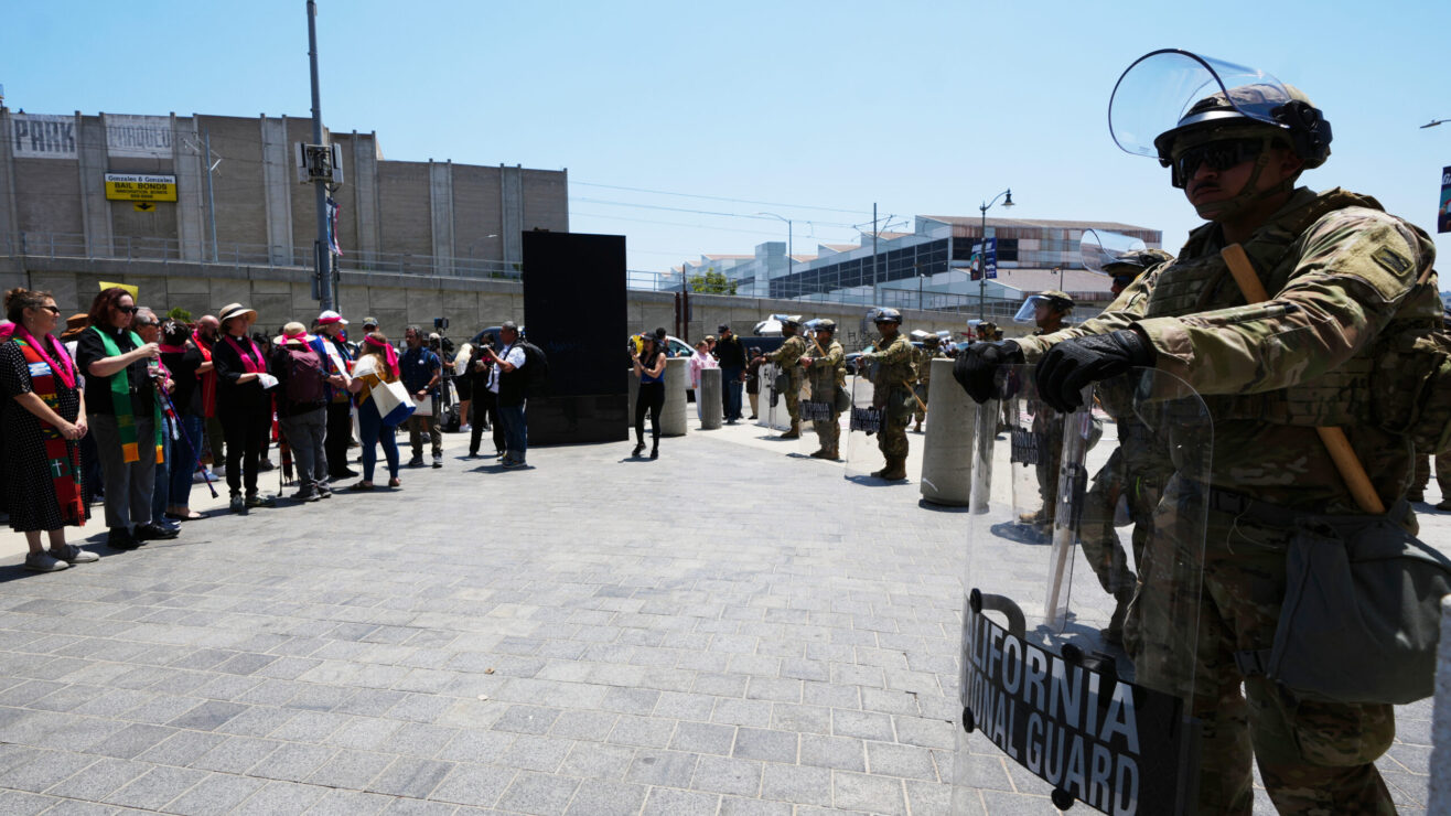 La Guardia Nacional vigila a los manifestantes que protestan por las redadas de ICE en Los Ángeles. Credit: Damian Dovarganes