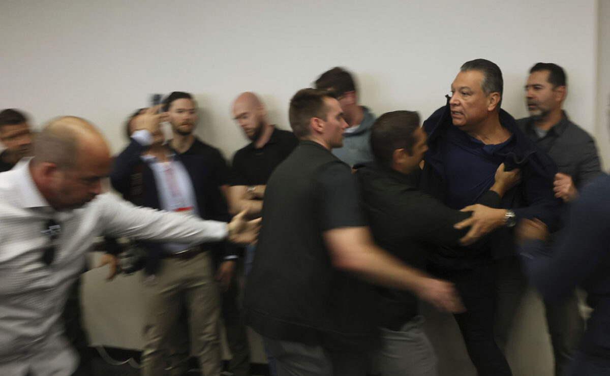 El senador Alex Padilla fue obligado a salir por la fuerza de una conferencia de prensa de Kristi Noem, secretaria de Seguridad Nacional. Credit: Etienne Laurent